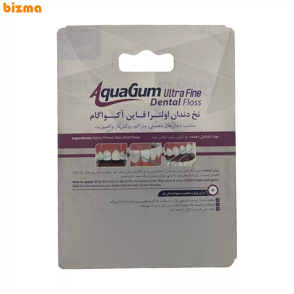 بهترین نوع کیفیت نخ، مقاوم در برابر ریش ریش شدن و حرکت آسان بین دندان ها. این نخ دندان برای افرادی که فاصله بین دندانی آنها بسیار کم است مناسب می باشد. همچنین افرادی که از ارتودنسی استفاده میکنند استفاده از این نخ دندان به آنها پیشنهاد میشود. نخ دندان فوق نازک آکواگام با متراژ 70 متر با رایحه دلپذیر نعنای تازه باعث ایجاد حس خنکی و طراوت می شود. این نخ دندان از نخ نایلون، موم و اسانس نعنا تشکیل شده است. این محصول از نخ چندلایه فوق نازک با استقامت بالا که به راحتی بین دندان ها حرکت می کند ساخته شده است و دارای موم برای حرکت بهتر بین دندان ها و جلوگیری از خراشیدگی لثه می باشد. از مزایای این کالا میتوان به داشتن قرقره جهت جمع کردن نخ اضافه به داخل پک اشاره کرد.
