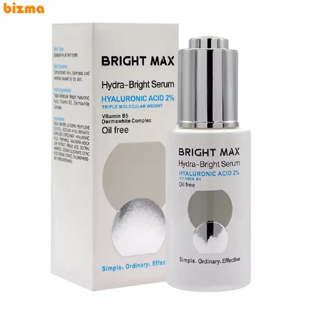 سرم هیالورونیک اسید 2 درصد برایت مکس با عملکرد چندگانه، آبرسان قوی و تقویت کننده لایه محافظ پوست است. در فرمولاسیون این محصول از 2% هیالورونیک اسید با وزن مولکولی سه گانه، برای ایجاد قابلیت نفوذ به لایه های مختلف پوست استفاده شده است. این محصول همچنین حاوی ویتامین ب5 و کمپلکس درماوایت است. ترکیب هیالورونیک اسید با کمپلکس درماوایت باعث آبرسانی عمقی، ترمیم سلولی، تثبیت پروتئینها و کمک به رفع لکها میشود تا پوستی با طراوت، یکدست با قوام بیشتر و روشنتر حاصل شود.