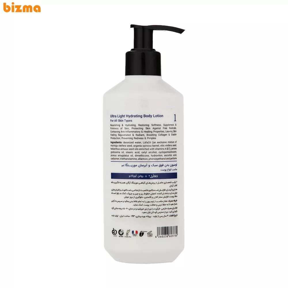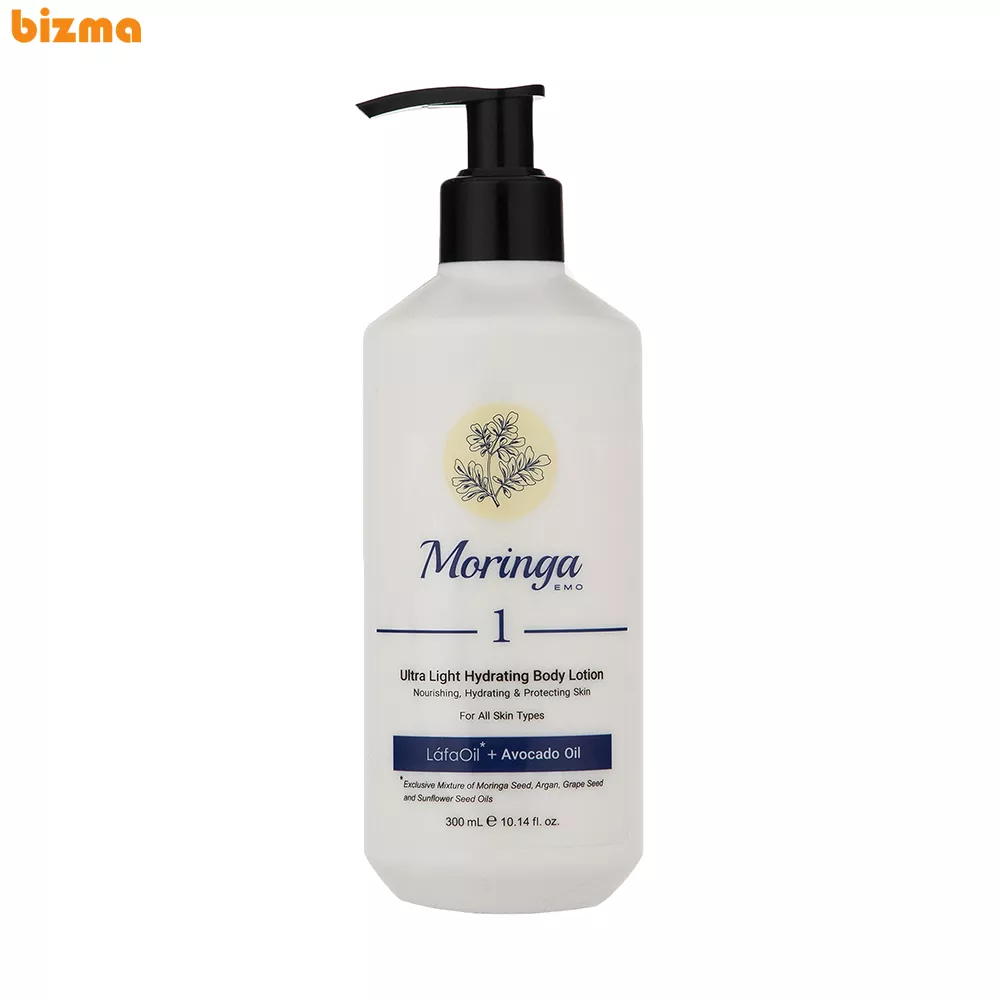 لوسیون بدن فوقسبک و آبرسان مورینگا امو 1 با قدرت آبرسانی بالا و جذب سریع، به عمق پوست نفوذ کرده و رطوبت آن را حفظ میکند. این لوسیون با تغذیه پوست، شفافیت و شادابی آن را افزایش داده و در برابر نور خورشید و آلودگیهای محیطی از آن محافظت میکند. همچنین با تحریک تولید کلاژن و الاستین، به پیشگیری از چینوچروک و افتادگی پوست کمک میکند.