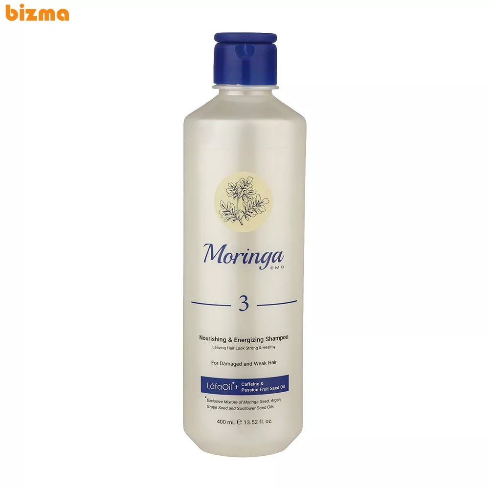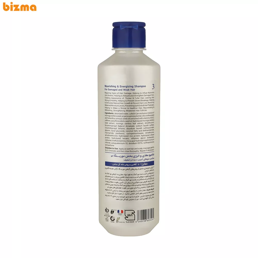 شامپو مغذی و انرژیبخش مورینگا اِمو SH03 با رطوبترسانی عمیق و موثر، باعث ترمیم و احیاء موهای آسیبدیده شده و از شکنندگی تارهای مو و ایجاد موخوره جلوگیری میکند. همچنین این محصول با تأمین مواد مغذی و تقویت فولیکولها، به جلوگیری از ریزش تارهای مو و بهبود حجم و ضخامت آنها کمک میکند.