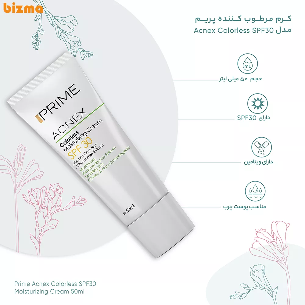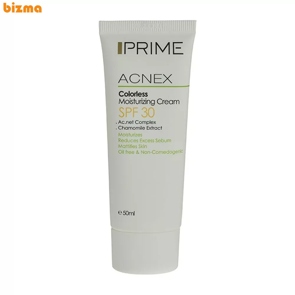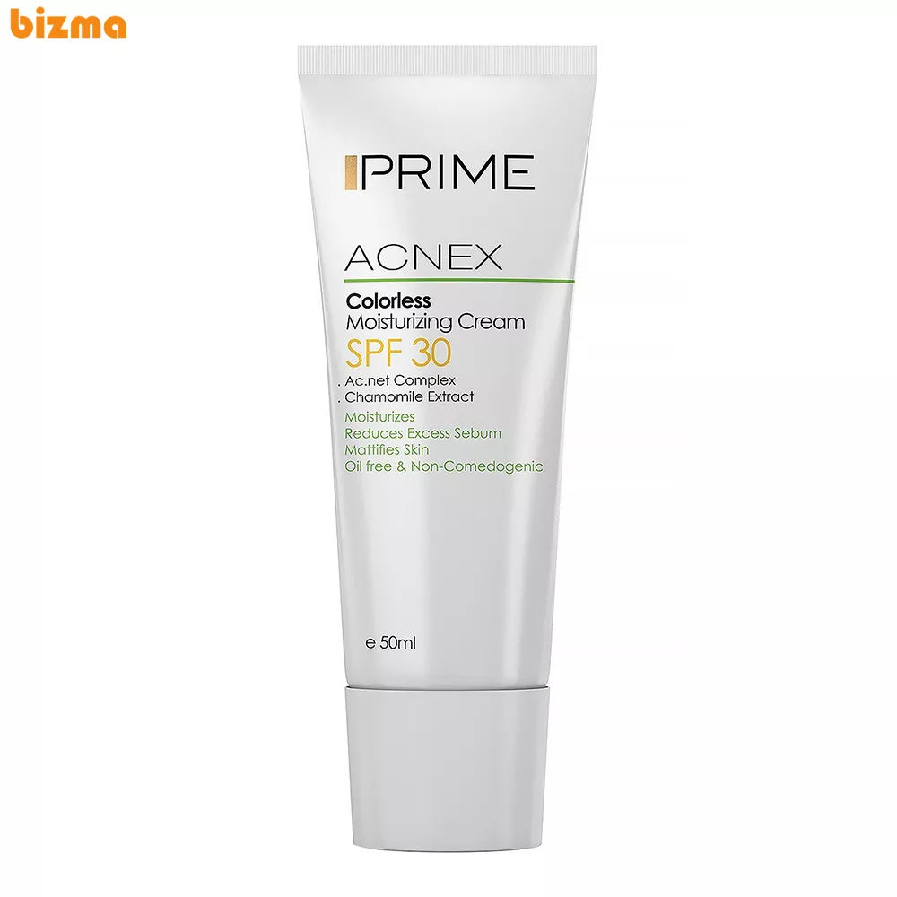 کرم مرطوب کننده بدون رنگ پرایم یک مرطوب کننده بدون روغن است. این مرطوب کننده که با نام Prime Acnex Colorless Moisturizing Cream نیز شناخته میشود که از SPF 30 بهره میبرد و با قابلیت کنترل ترشح سبوم و خاصیت ضد آکنه بودن، مهار کنندهی قوی باکتری های مولد آکنه به شمار میرود. این محصول پوششی طولانی و مناسب برای زخمهای آکنه است. همچنین این کرم یکی از بهترین کرمهای جاذب چربی پوست و مات کنندهی آن به شمار میرود. ضدجوش بودن یکی از مهمترین شاخصههاییست که برای این کرم مرطوب کننده ذکر شده است و این شاخصه شامل هر دو نوع جوش سرسفید و سرسیاه میشود.