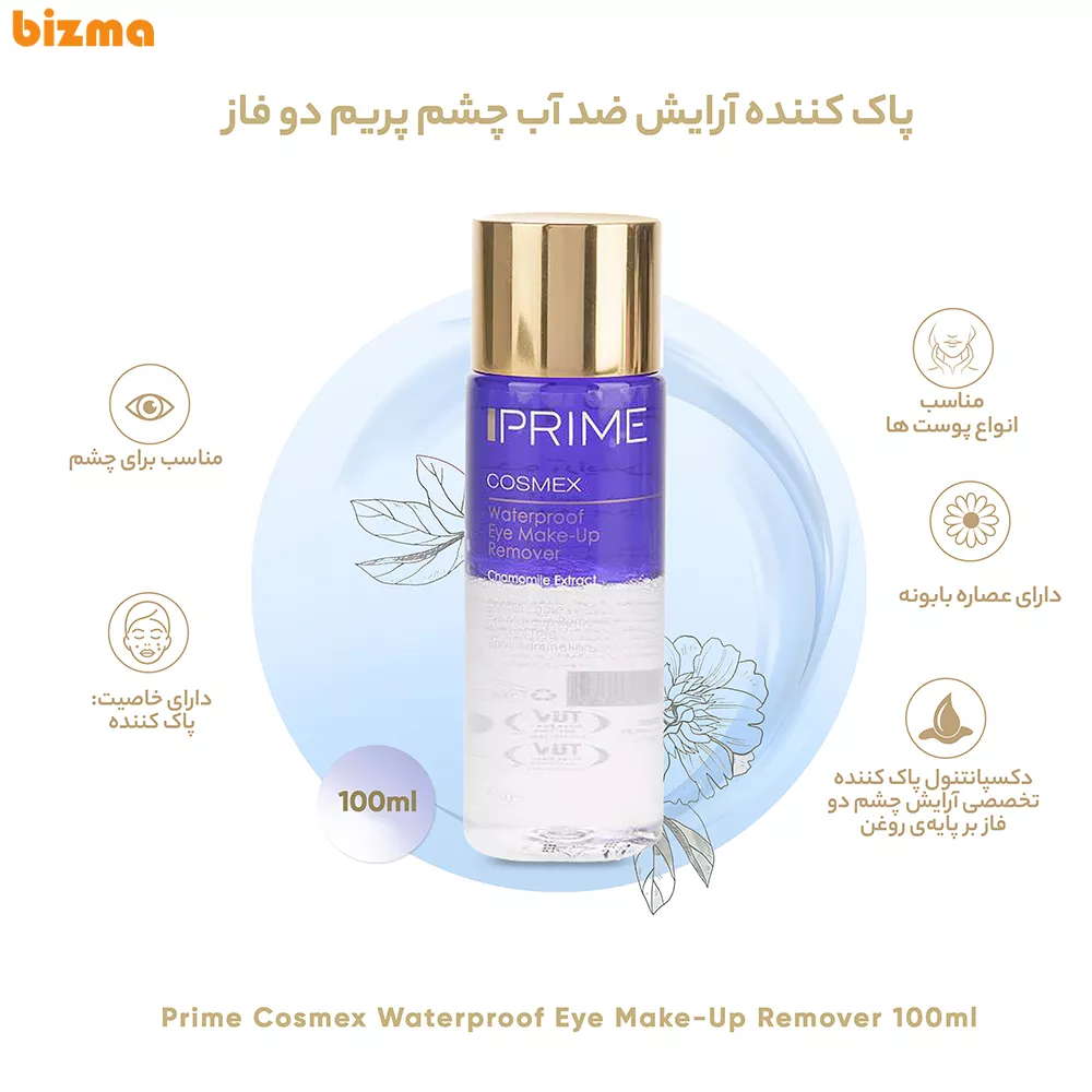 پاککننده آرایشی دوفاز چشم پرایم جهت پاک کردن آرایش چشم به بازار عرضه شده و با انواع پوستها سازگاری دارد. این محصول با اثر پاککنندگی بالا آرایش چشم را بهراحتی پاک میکند و اثری از سیاهی در دور چشم شاهد نخواهید داشت. با استفاده از یک پد و یا پنبه خشک آغشته شده به این محلول اثر پاک شدن موثرذتر خواهد بود. شرکت پرایم تولید کننده محصولات بهداشتی است که در این زمینه موفق عمل کرده چرا که نیاز مشتریان خود را سنجیده است. این پاککننده حاوی عصاره بابونه و پرو ویتامین B5 است. عصاره بابونه و ویتامین B5 موجود در این محصول در ضدعفونی و برطرف کردن التهابهای پوستی اثر دارد و به ترمیم آسیبهای سطحی پوست کمک میکند. این محصول با قابلیت دو فاز بودن اثر پاک کنندگی را افزایش داده است؛ دو فاز بودن به این معنی است که قبل از استفاده حتما باید محلول را تکان داد تا محلول به صورت یکدست شود و آن زمان قابل استفاده خواهد بود. پاککننده دوفاز پرایم با پایهی سیلیکونی حالت ابریشمی بر روی سطح پوست پس از مصرف ایجاد میکند که حس سبکی و طراوت را به شما بازمیگرداند. محلول پاککننده آرایش چشم پرایم مدل «Cosmex Waterproof Eye Make-Up Remover» با حجم 100 میلیلیتر جهت پاک کردن آرایش چشم و لب قابل استفاده است که اثری از سیاهی را در اطراف چشم بر جای نمیگذارد.